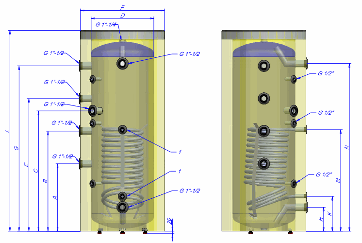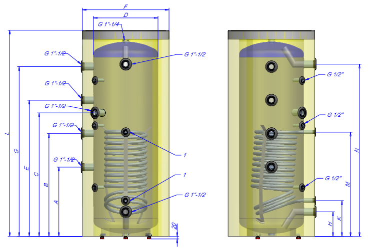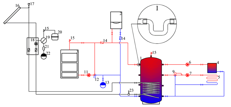 • Модель с одним змеевиком позволяет двум разным источникам тепла одновременно отдавать энергию в буфер /напр. солнечная система и котел/