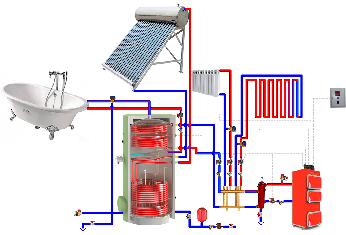 • Модель с двумя змеевиками предоставляет множество возможностей – как для комбинации нескольких разных и независимых источников тепла, которые будут отдавать энергию (солнечный коллектор, котел, теплонасос и пр.), так и для включения одновременно разных потребителей энергии (напольное отопление, радиаторы, водяные конвекторы и пр.).