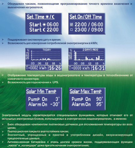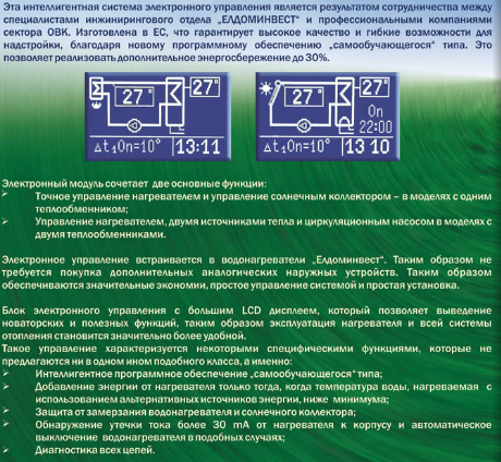• Электронный модуль сочетает в себе не только точное управление электрическим нагревателем, а и управление работой солнечного коллектора;