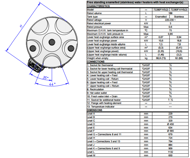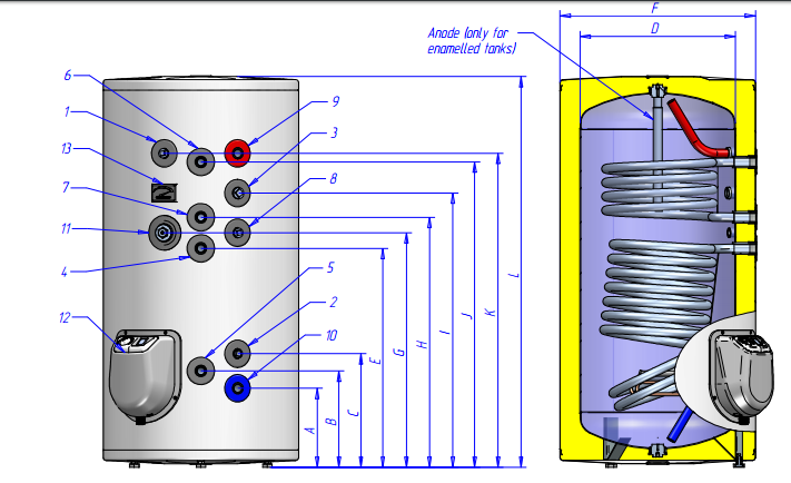 нижний змеевик работает в аккумулирующем режиме и подходит для подключения к солнечному коллектору или термонасосу.