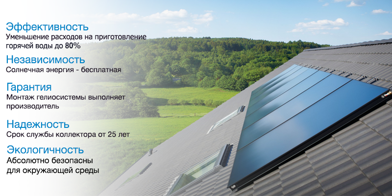 Солнечные коллекторы поглощают солнечную энергию, превращая ее в тепловую энергию. За счет солнечной энергии эта система способна обеспечить от 70 до 100% ежедневной потребности в горячем водоснабжении для бытовых целей и снизить расходы на отопление помещений. Солнечные коллекторы используются: для обеспечения горячего водоснабжения в домах и на дачах, в гостиницах, санаториях, пансионатах, спортивных комплексах, учреждениях общественного питания, турбазах, производственных, сельскохозяйственных и других объектах; для подогрева воды в бассейнах; в устройствах теплого пола.