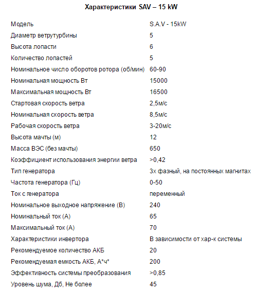Ветроэлектростанции «S.A.V» серийно изготавливаются мощностью от 0,5 до 20 кВт, так же возможно производство под заказ ветрогенераторов мощностью до 30 кВт.
